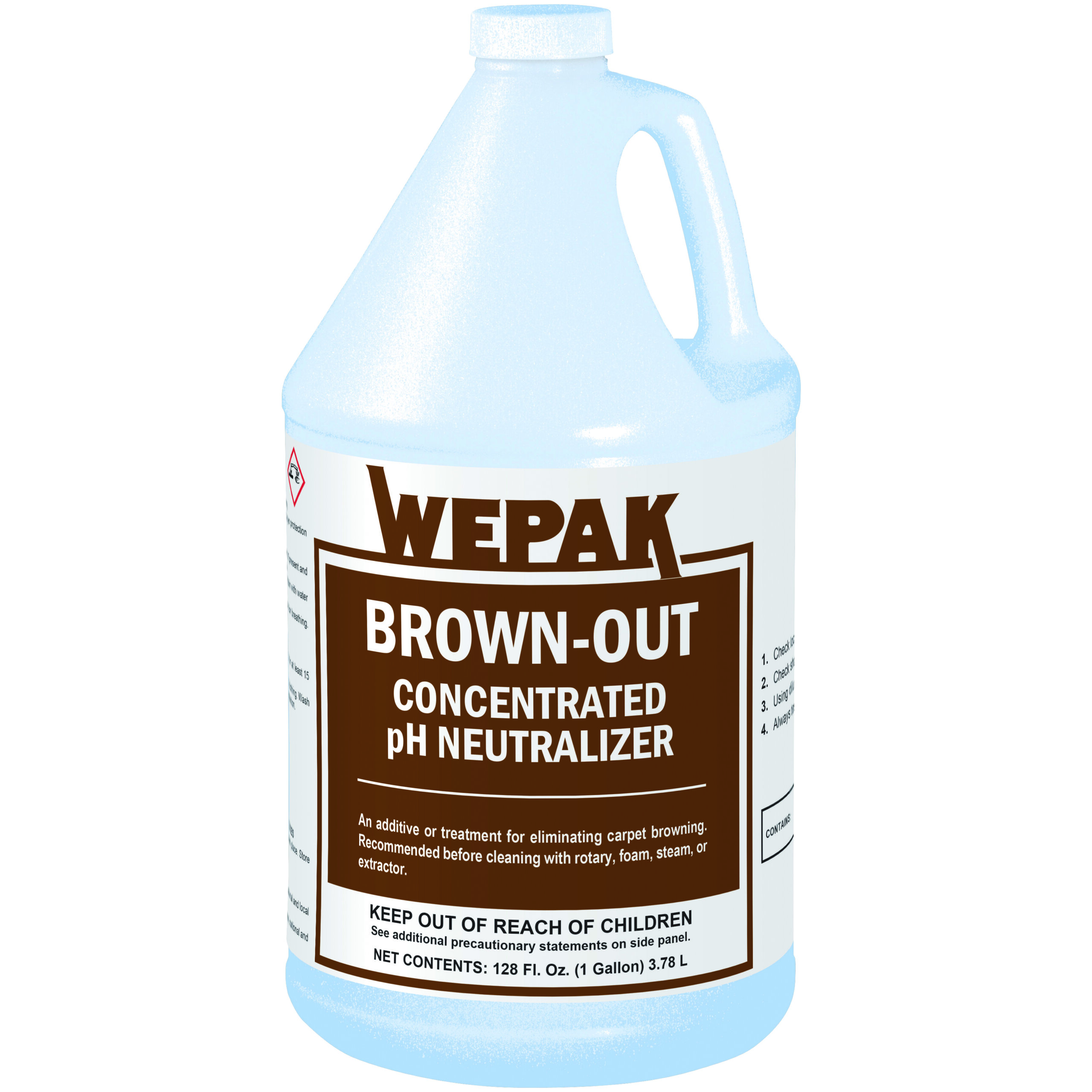 Brown-Out treatment is an additive formulated to eliminate brown discoloration that can occur in carpets that have been cleaned previously with shampoo or water with a high PH value. Brown-Out is recommended for use prior to cleaning carpeting with rotary, foam, steam, or extraction equipment.  Before shampooing, check both the local water and shampoo that will be used with PH test paper strips. If the results indicate a PH value above 7, simply combine four ounces of Brown-Out per gallon of water and add this to the rinse water as per the manufacturer’s specifications.