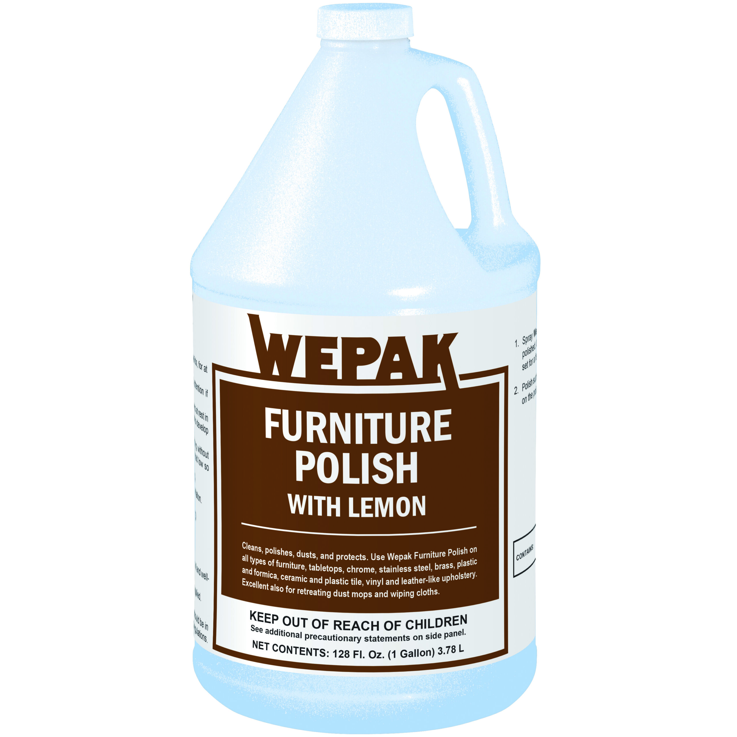 WePak’s versatile Furniture Polish with Lemon is great for polishing, dusting, and protecting a wide variety of surfaces, such as furniture, tabletops, chrome, stainless steel, brass, plastics, plastic tile, ceramics, vinyl, and leatherette upholstery.