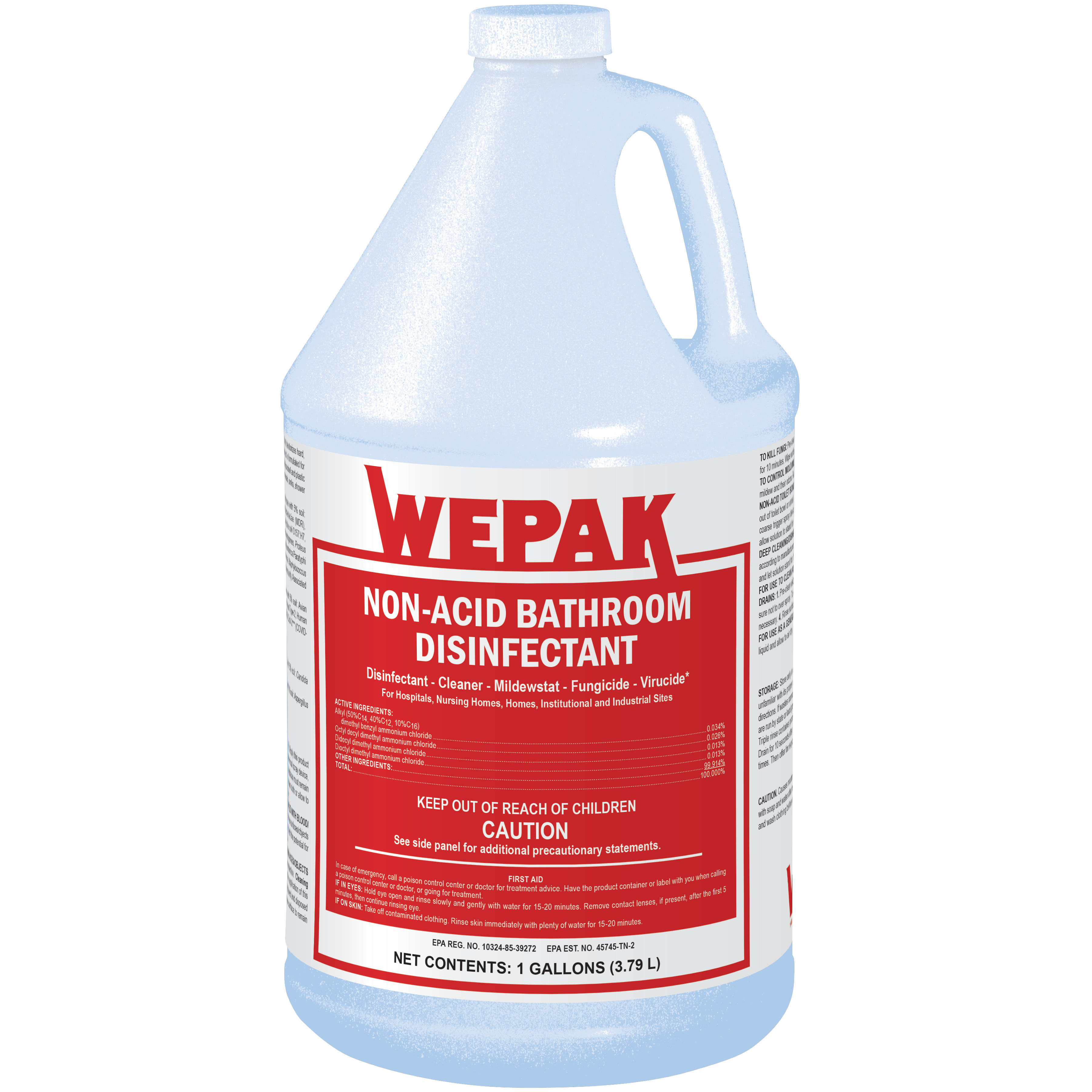 When used as directed, Non-Acid Bathroom Disinfectant’s broad spectrum antibacterial and virucidal formula** eliminates the threat of cross-contamination on hard (nonporous) surfaces in just one step. Non-Acid Bathroom Disinfectant has been developed for use in hospitals, nursing homes, medical, and dental offices, institutional facilities, laboratories, factories, office buildings, churches, hotels, and transportation terminals. This versatile disinfectant is also great for use in bathrooms for sinks, toilet bowls, urinals, shower stalls, and tubs, or in kitchens on floors, countertops, stovetops, and appliance exteriors. * This convenient ready-to-use formula will sanitize your bathroom’s surfaces and deodorize with a pleasant floral scent.